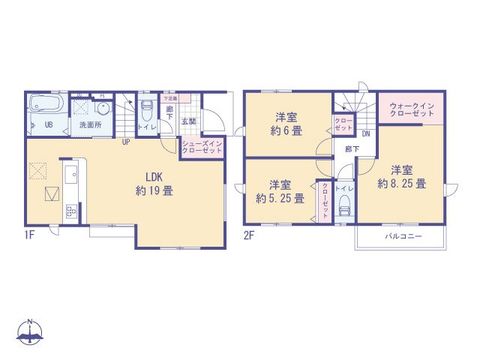 | 間取内容 | 1階LDK19畳1室 2階洋室8.25畳1室 2階洋室6畳1室 2階洋室5.25畳1室 |